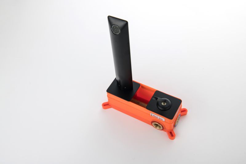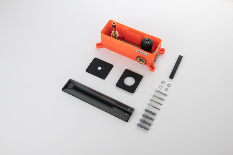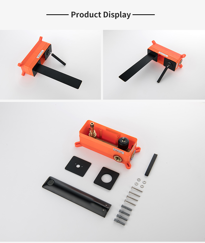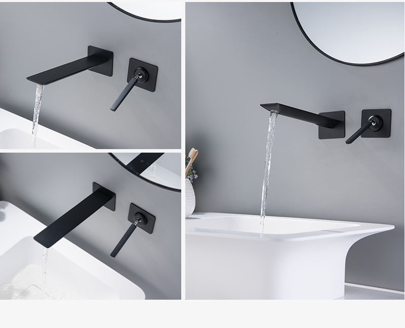 Brass main body build in wall basin faucet. Matte black color and the minimalism design. Single lever controlling hot and cold water inlet. Best option for your bathroom decoration.