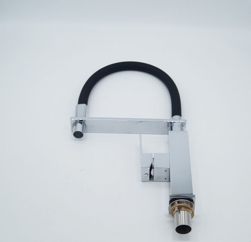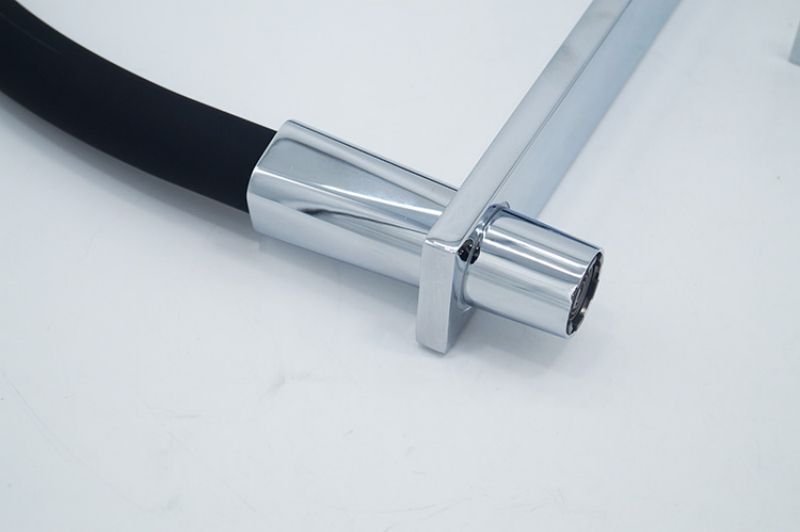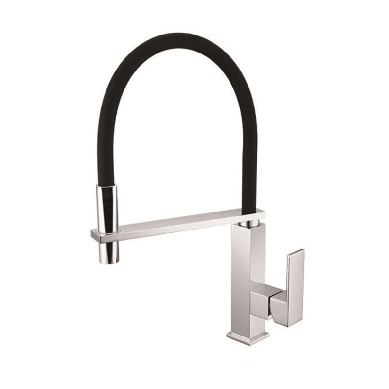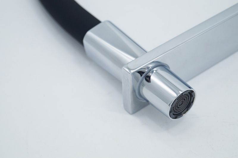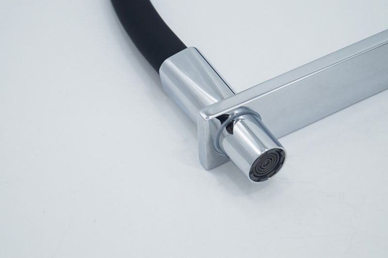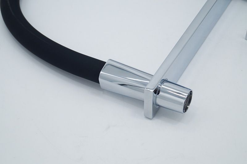 With pull down sprayer, an extended retractable hose and swivelable arc offers smooth maneuverability