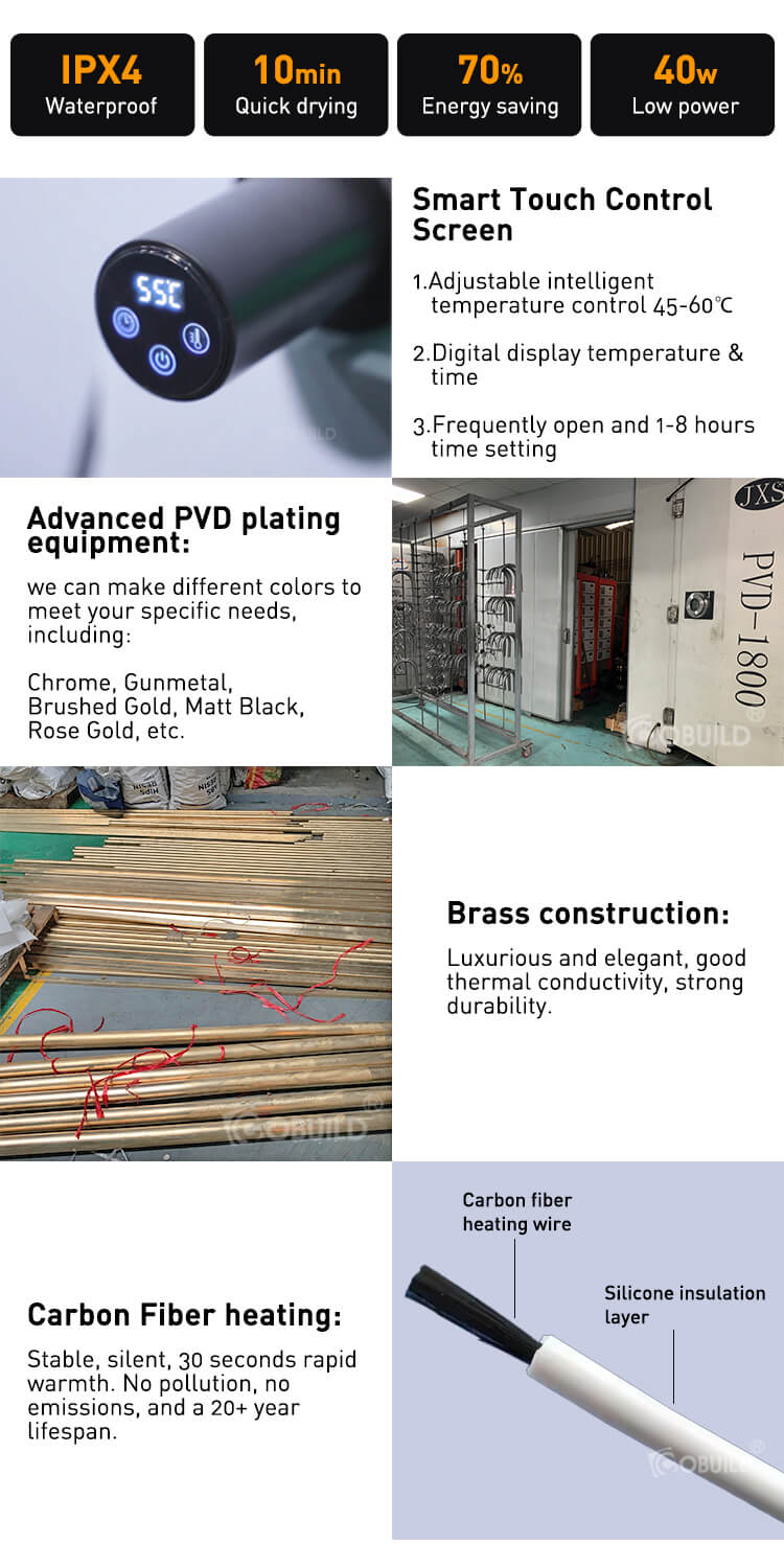 Adjustable intelligent temperature control 45-60℃,frequently open and 1-8 time setting, digital display temperature & time, energy saving low-voltage electricity 54w