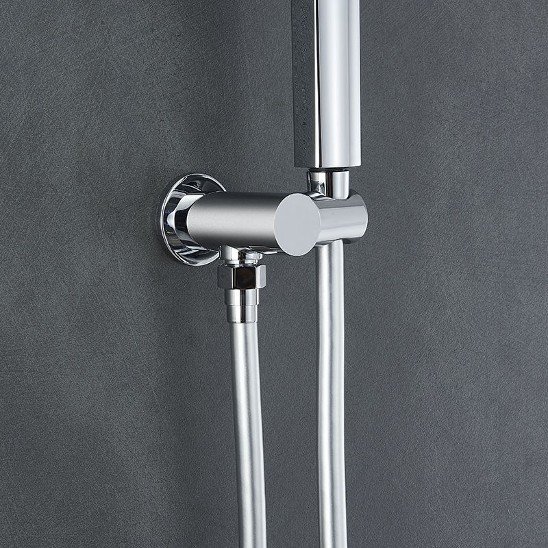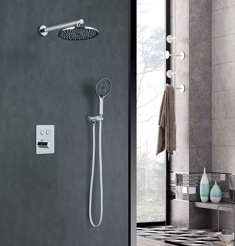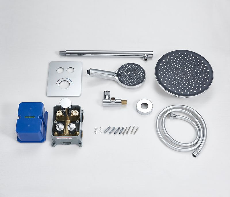 1.brass shower arm 2.PH59 copper faucet body+magic box 3.brass adjustable water adaptor. 4.ABS 10 inches rain shower and ABS 5 inches handhled shower head & PVC shower hose