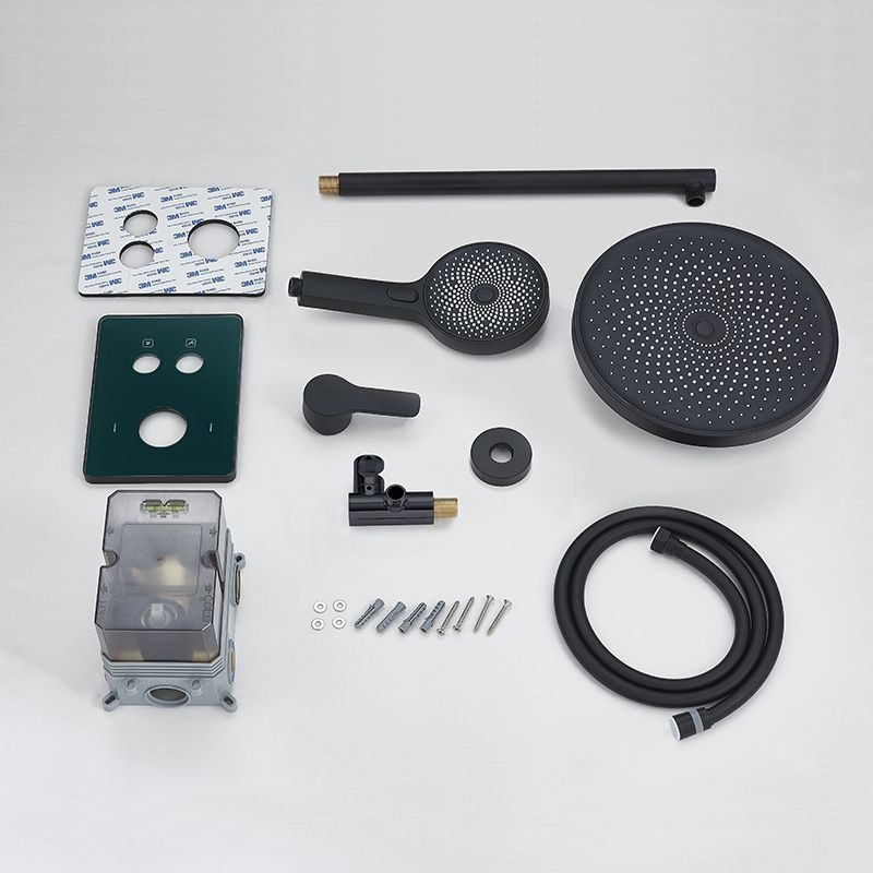 1.brass shower arm 2.PH59 copper faucet body + magic box 3.brass adjustable water adaptor. 4.ABS 10 inches rain shower and ABS 5 inches handhled shower head & PVC shower hose